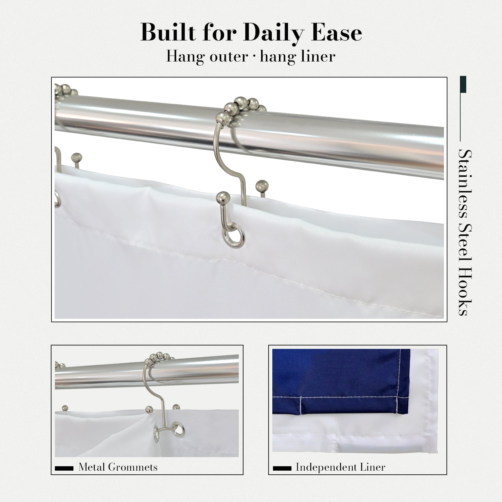 · Double layer shower curtain set with liner, 72"W x 72"H with 12 button holes for easy hanging;