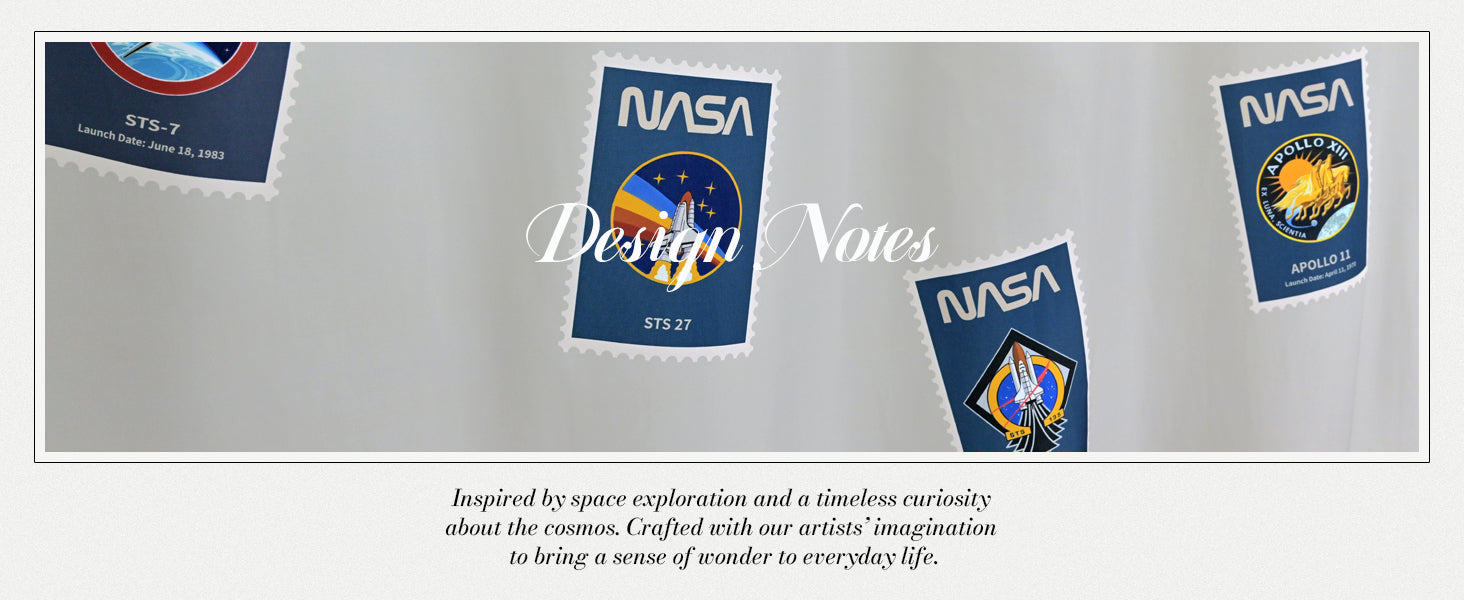 Inspired by the colorful emblems worn by astronauts across decades of discovery, this design reimagines iconic mission patches as scattered postage stamps on a gallery-white backdrop—transforming your space into a bright, clean archive of adventure.