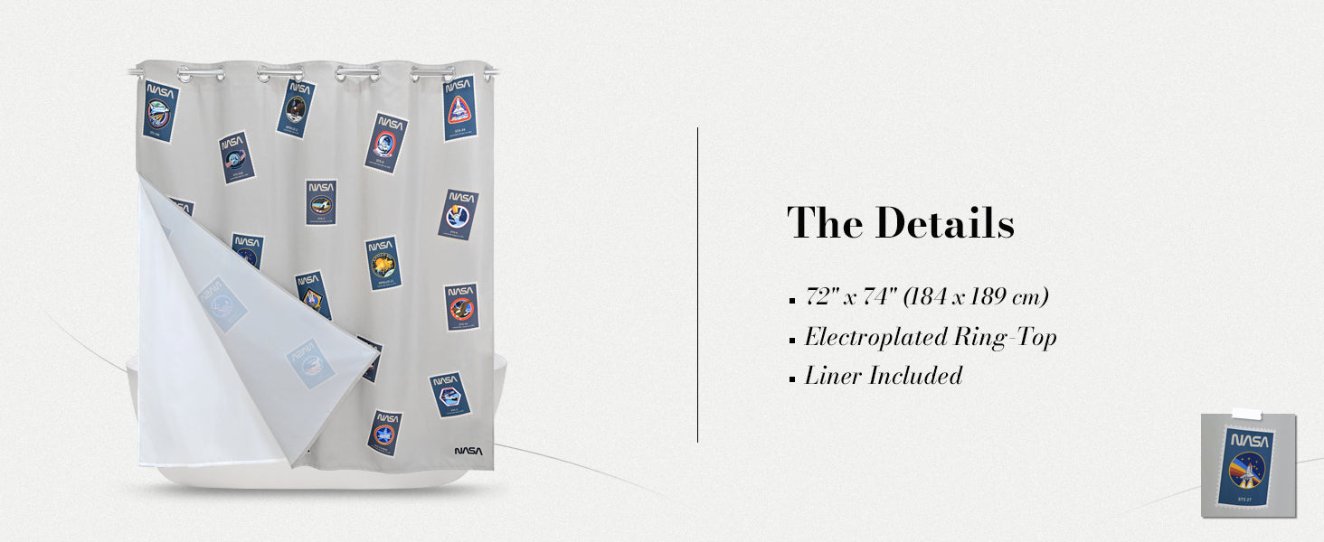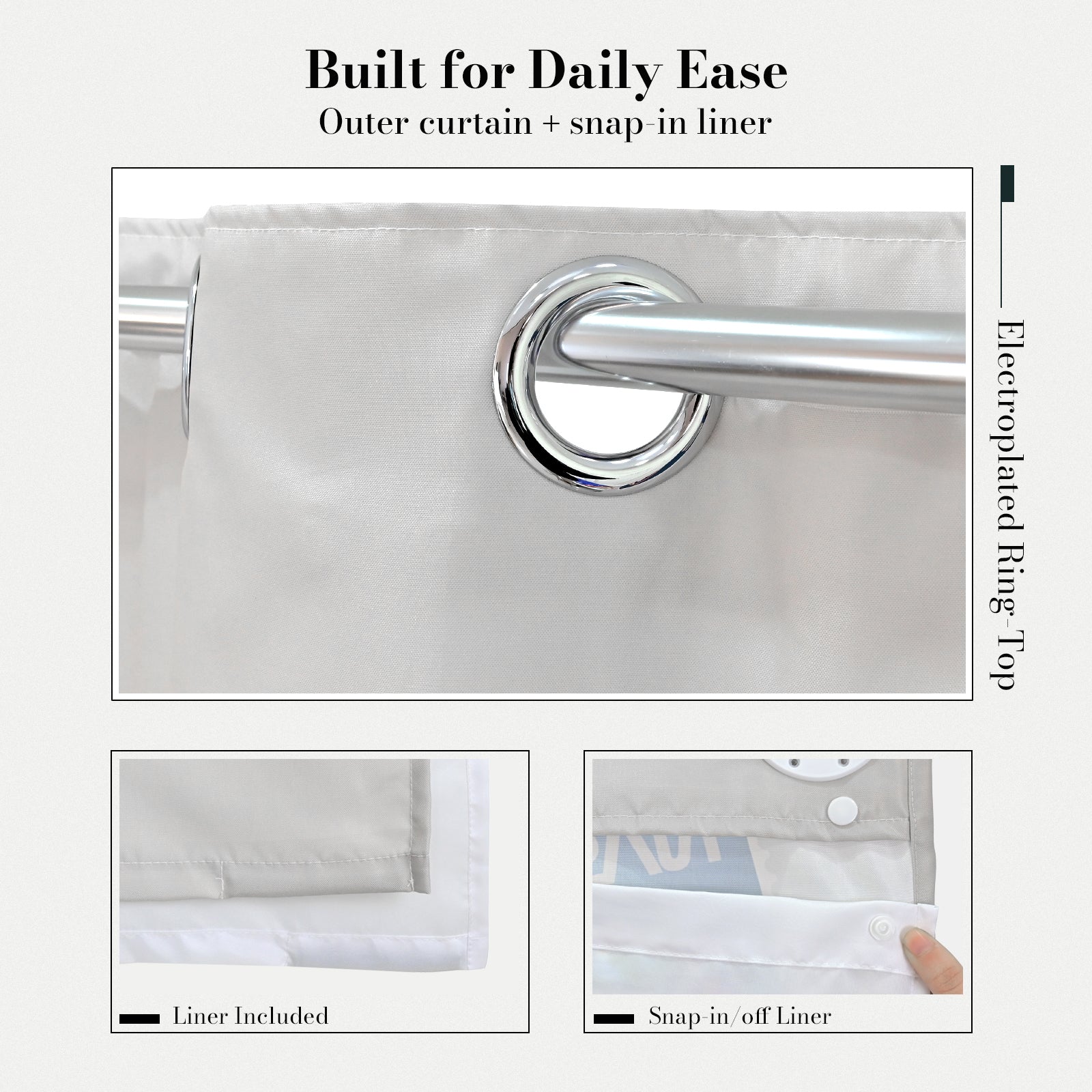 · Hookless shower curtain set with liner, 72" W x 74" L with 12 hookless chrome plated Rings for easy hanging