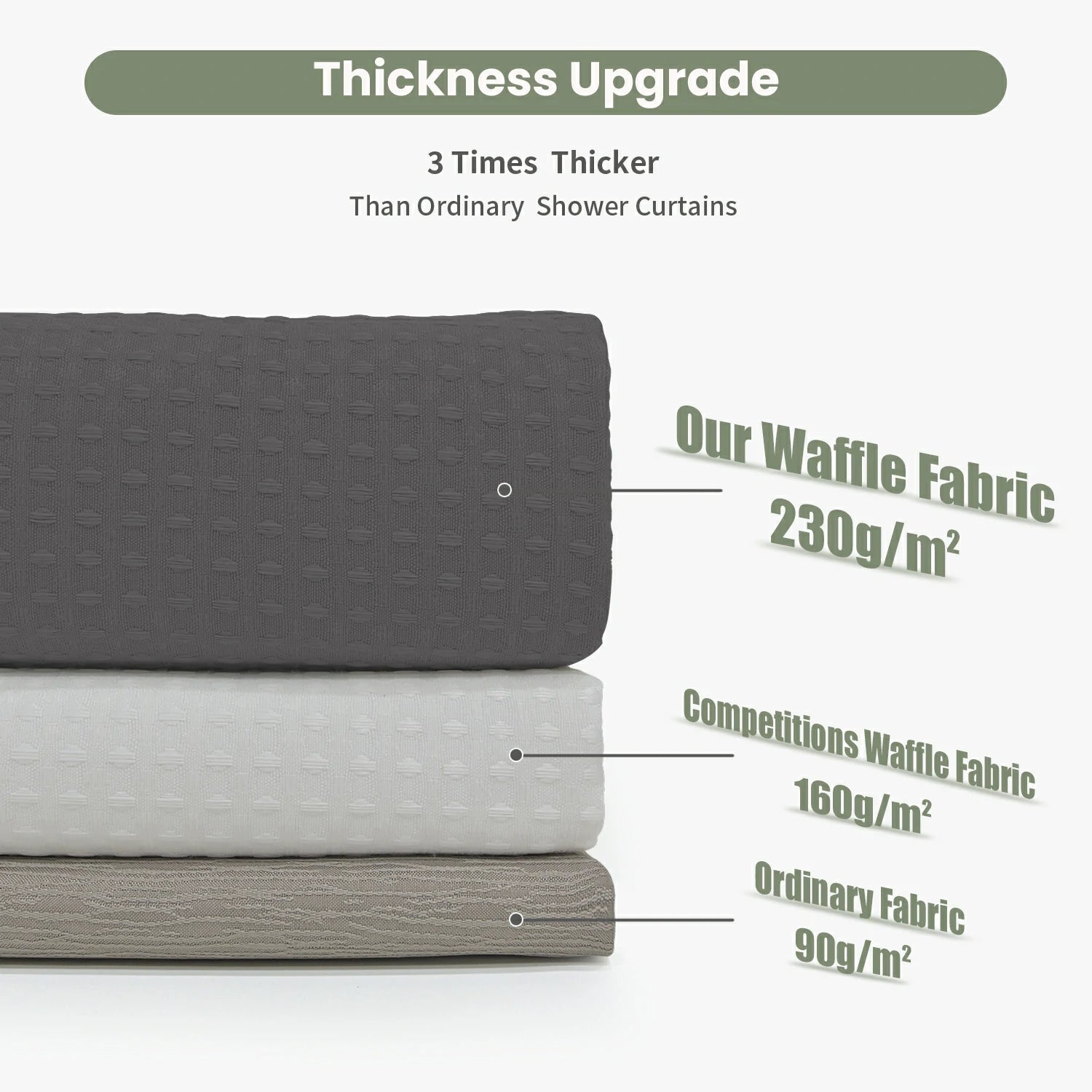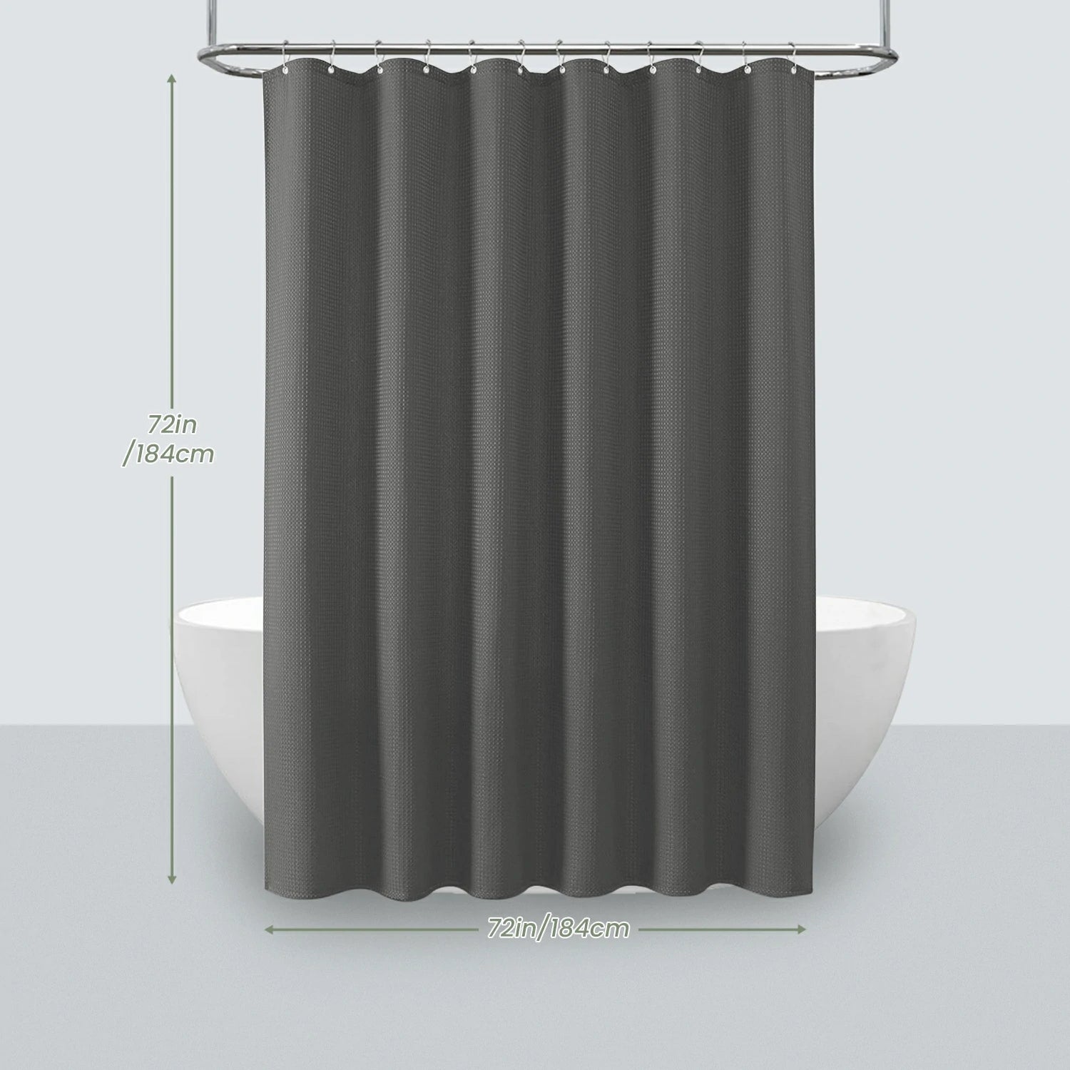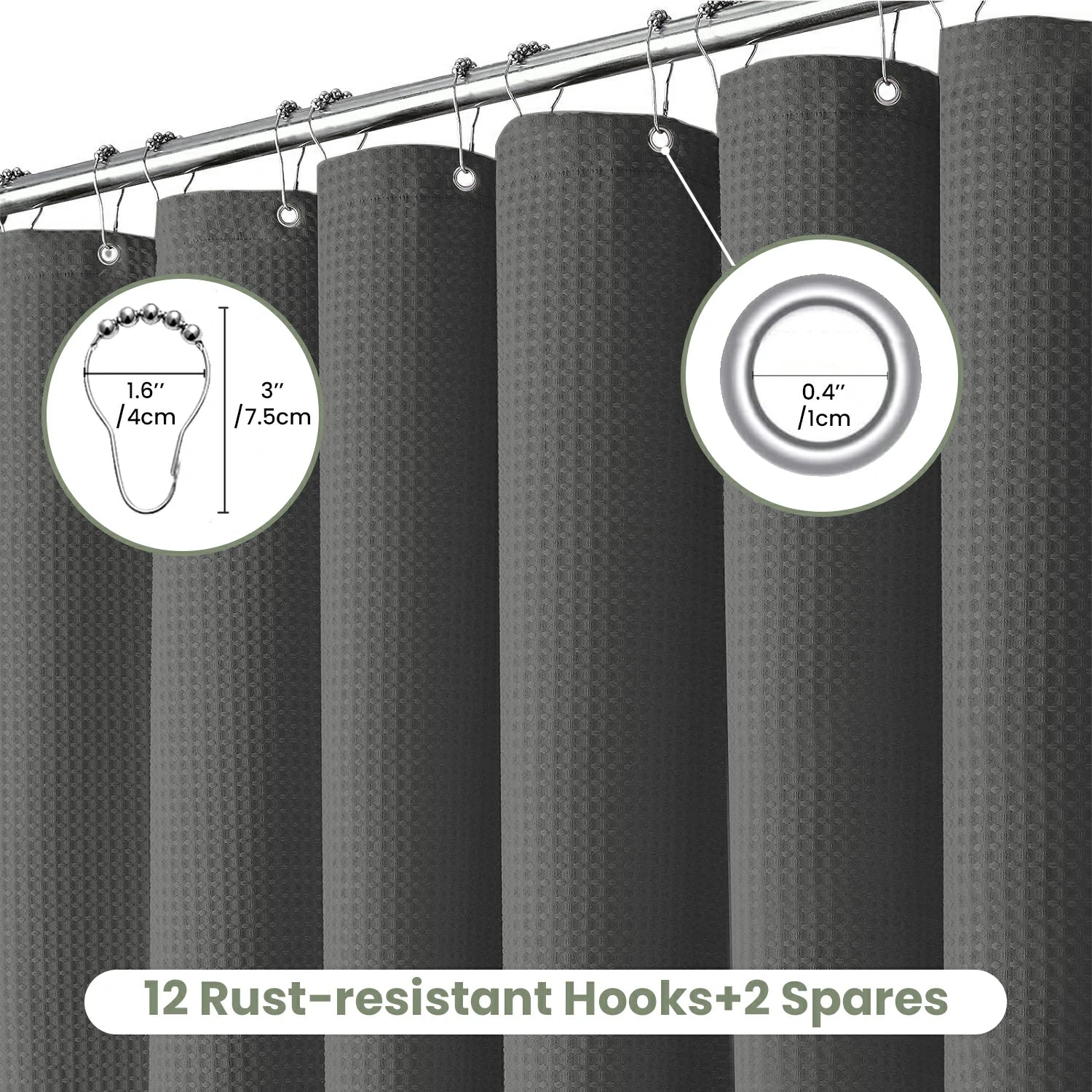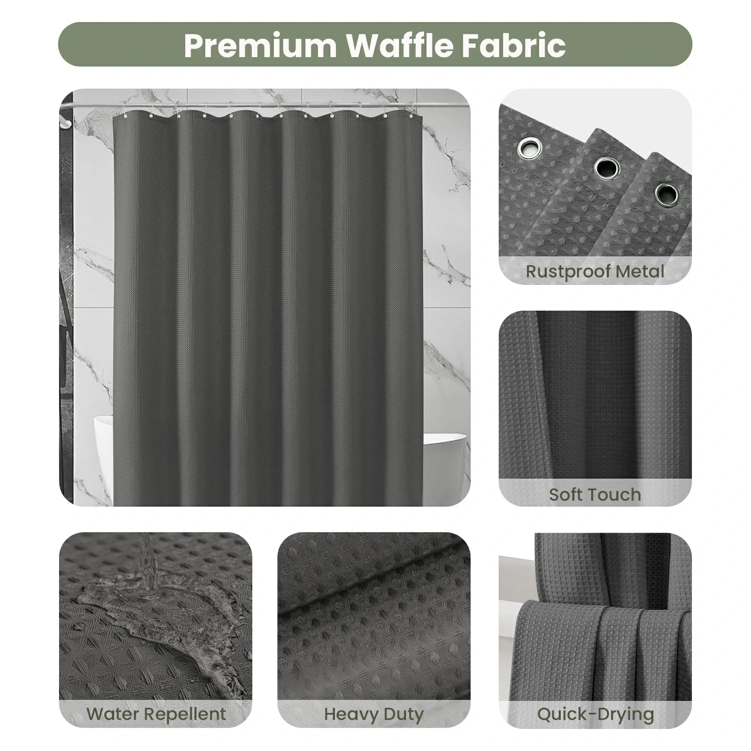 The Solid Waffle Weave Shower Curtain (Graphite Gray) is a 230 GSM, 100% polyester shower curtain with a waffle texture, designed to be water-repellent and quick-drying for daily use. It comes with 12 rust-resistant hooks plus 2 spare hooks, and features two magnetic strips at the bottom to help keep the curtain in place and reduce clinging. Multiple size options are available to fit most bathtubs and shower rods, and the curtain is machine washable for easy care.