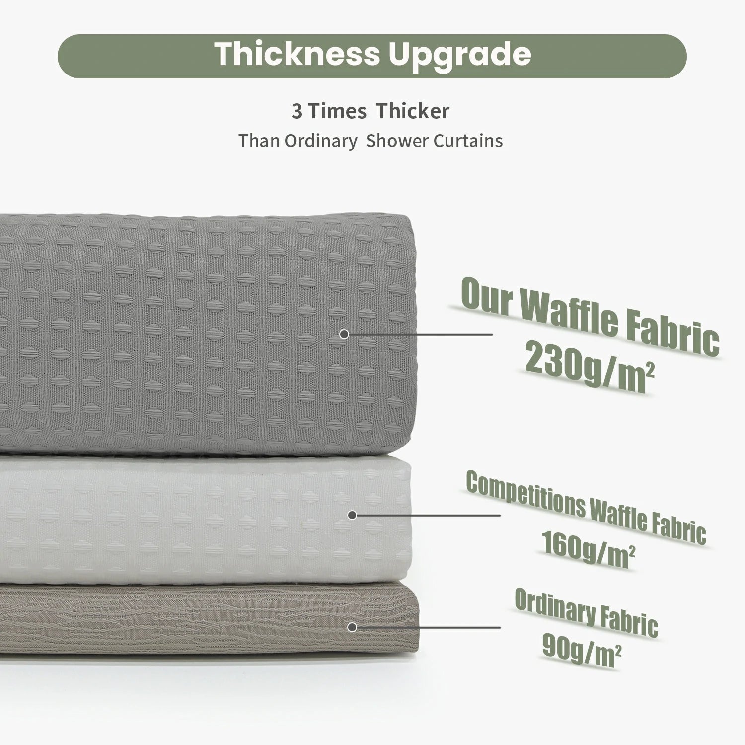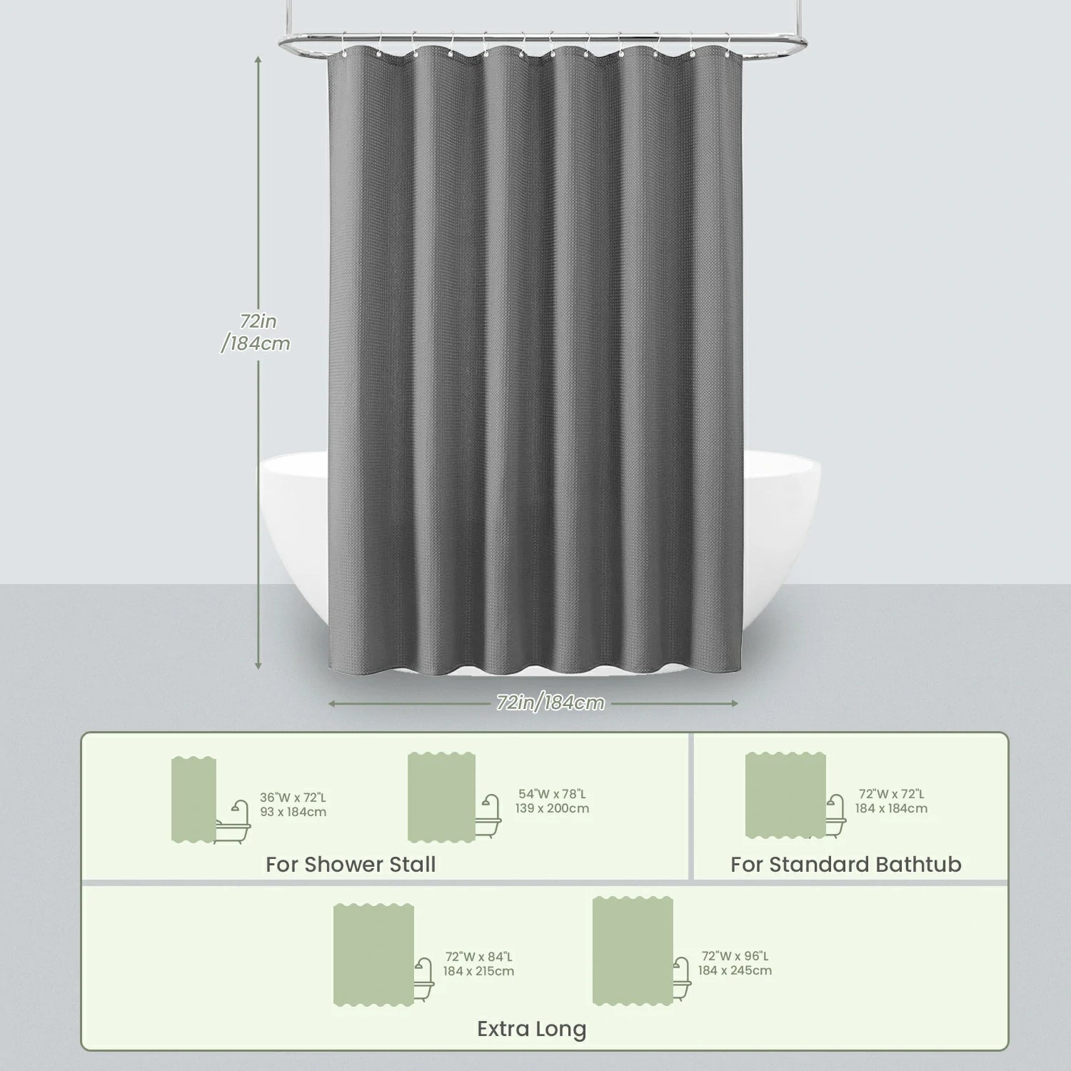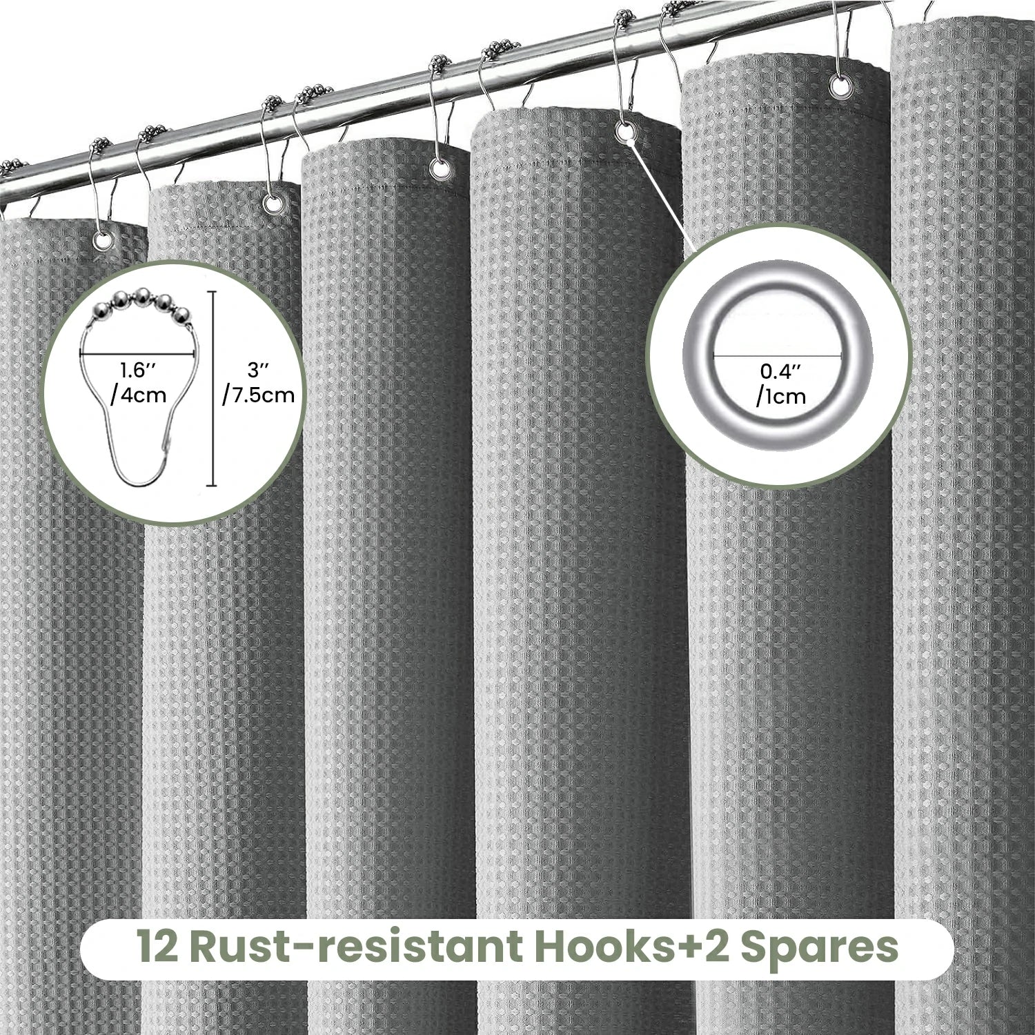 The Solid Waffle Weave Shower Curtain (Dark Gray) is a 230 GSM, 100% polyester shower curtain with a waffle texture, designed to be water-repellent and quick-drying for daily use. It comes with 12 rust-resistant hooks plus 2 spare hooks, and features two magnetic strips at the bottom to help keep the curtain in place and reduce clinging. Multiple size options are available to fit most bathtubs and shower rods, and the curtain is machine washable for easy care.