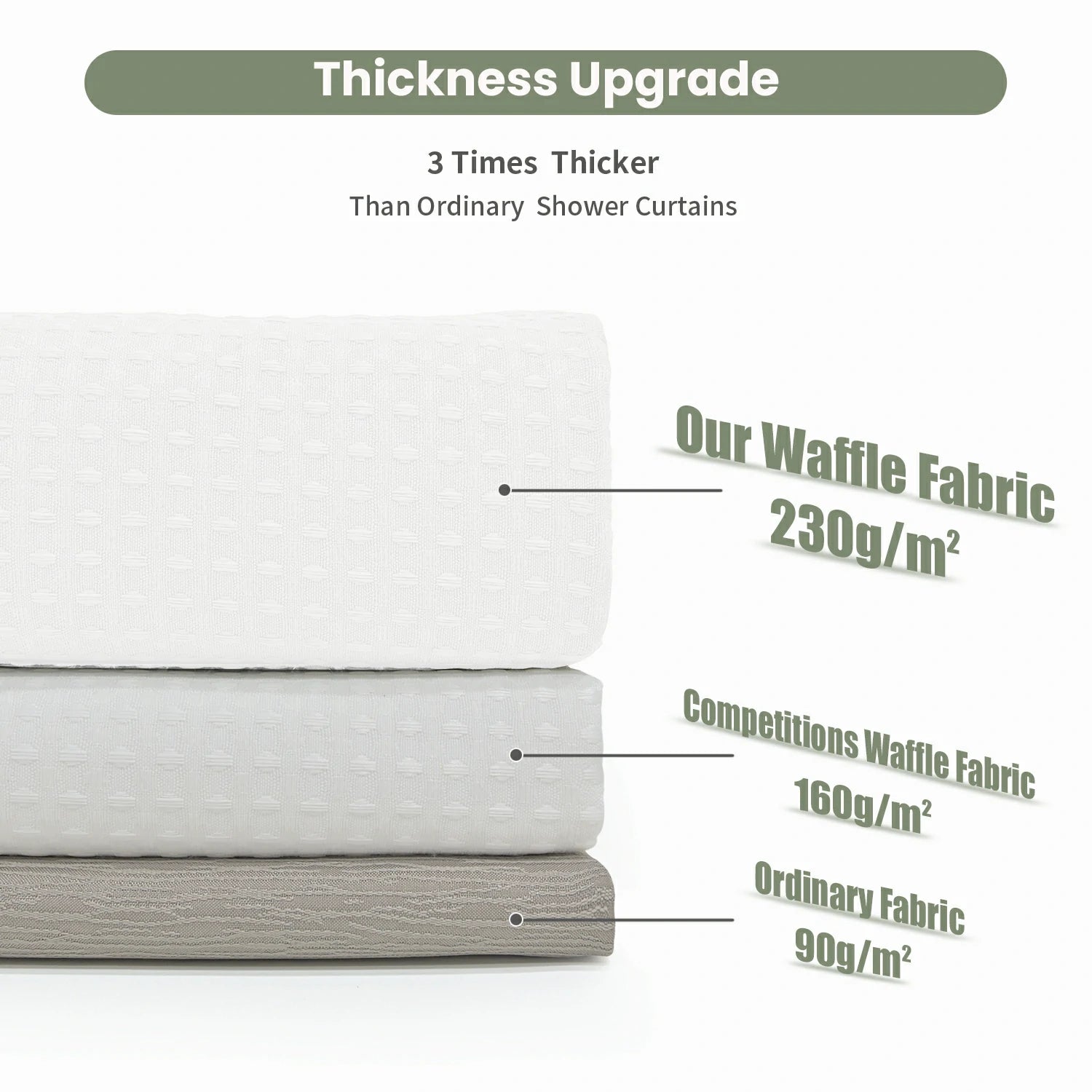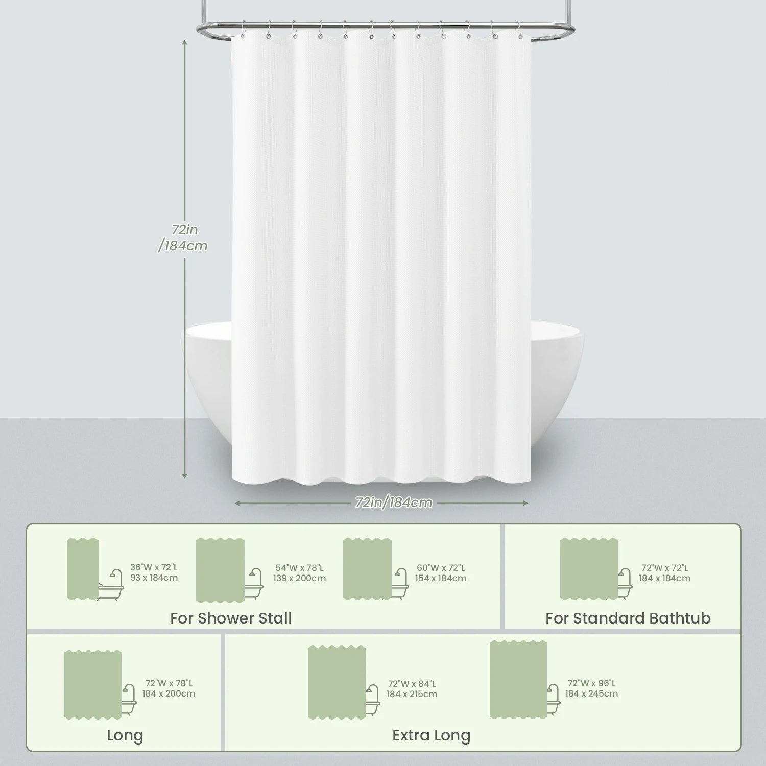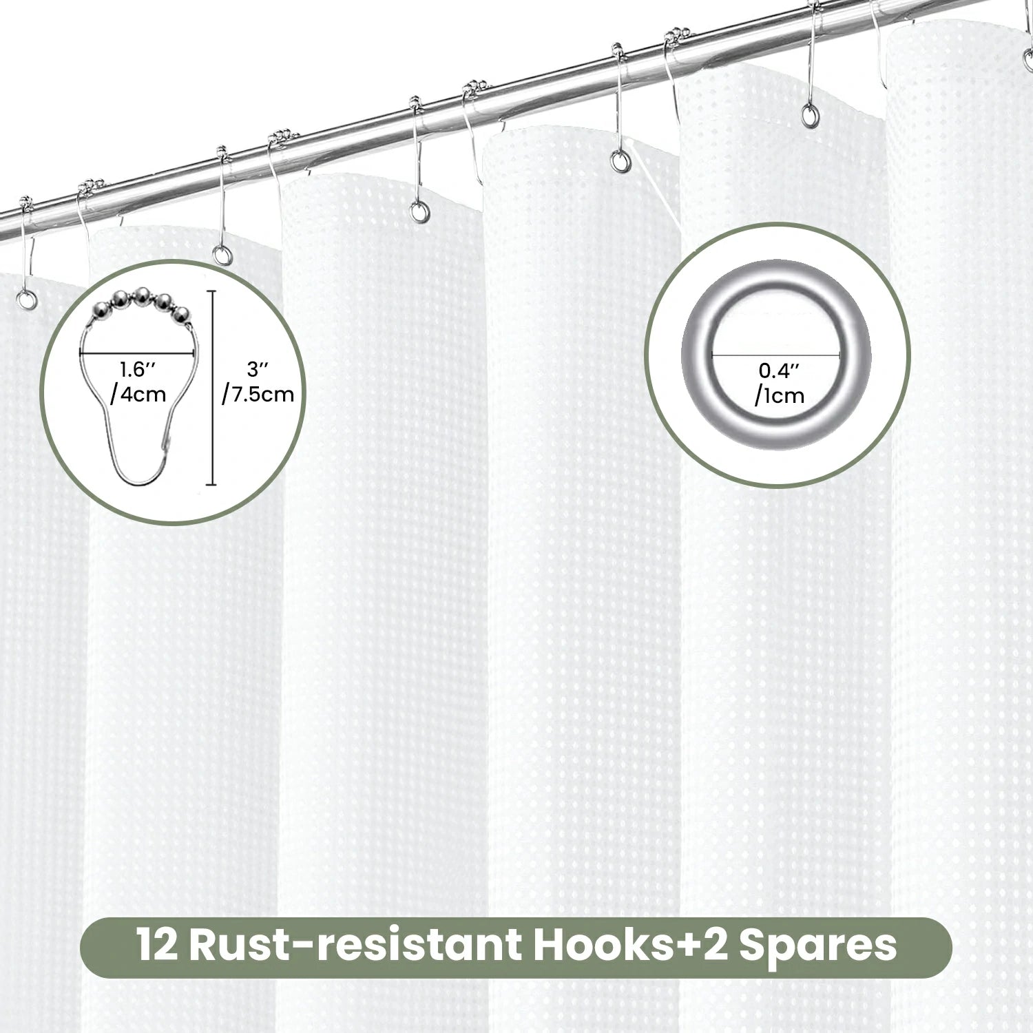 The Solid Waffle Weave Shower Curtain (White) is a 230 GSM, 100% polyester shower curtain with a waffle texture, designed to be water-repellent and quick-drying for daily use. It comes with 12 rust-resistant hooks plus 2 spare hooks, and features two magnetic strips at the bottom to help keep the curtain in place and reduce clinging. Multiple size options are available to fit most bathtubs and shower rods, and the curtain is machine washable for easy care.