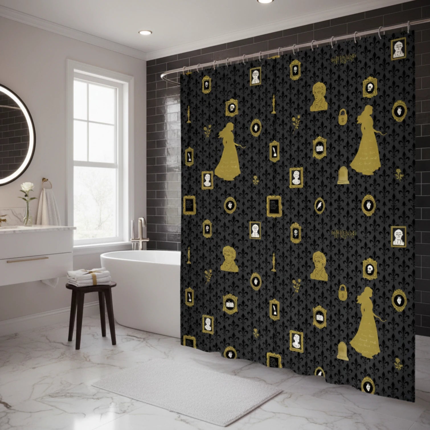 Introduce a touch of luxurious, gothic grandeur to your bathroom with this opulent patterned shower curtain, the definitive statement piece in our Wuthering Heights Series Collection. This design moves beyond single scenes to create a sophisticated, repeating tapestry of the novel's most powerful symbols.