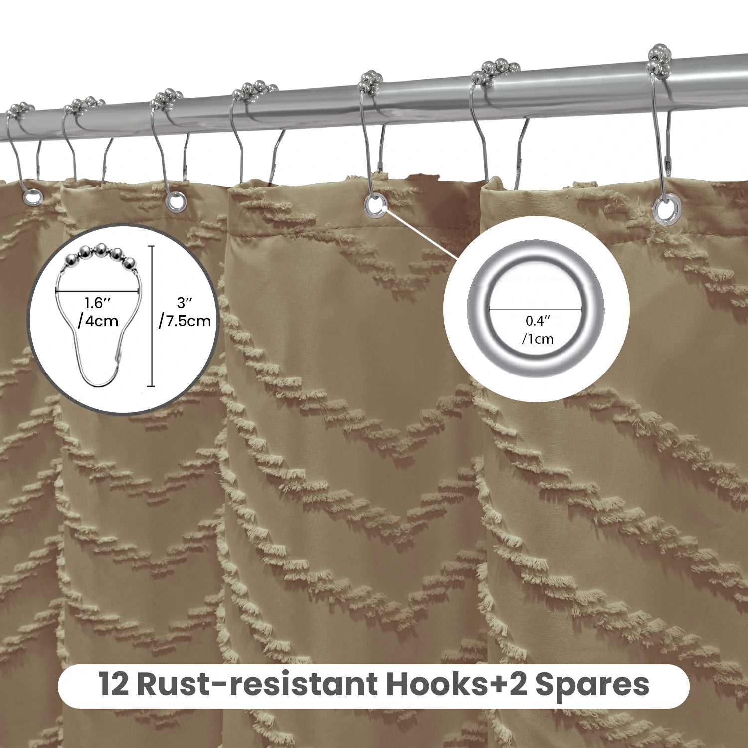 Tufted chevron texture brings a modern boho statement to your bathroom, while the water-repellent, quick-dry polyester helps keep splashes contained and daily upkeep simple. The curtain includes rust-resistant hooks with spares for reliable hanging, and the fringe tassel hem adds a finished look while helping reduce flutter for a calmer, more private shower feel. Soft, breathable fabric is machine washable and designed to resist fading and heavy wrinkles, making it an easy refresh for everyday spaces.