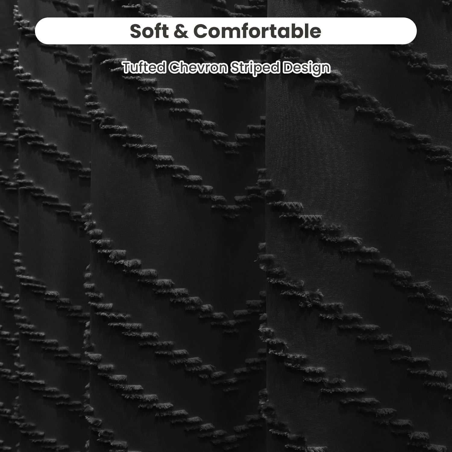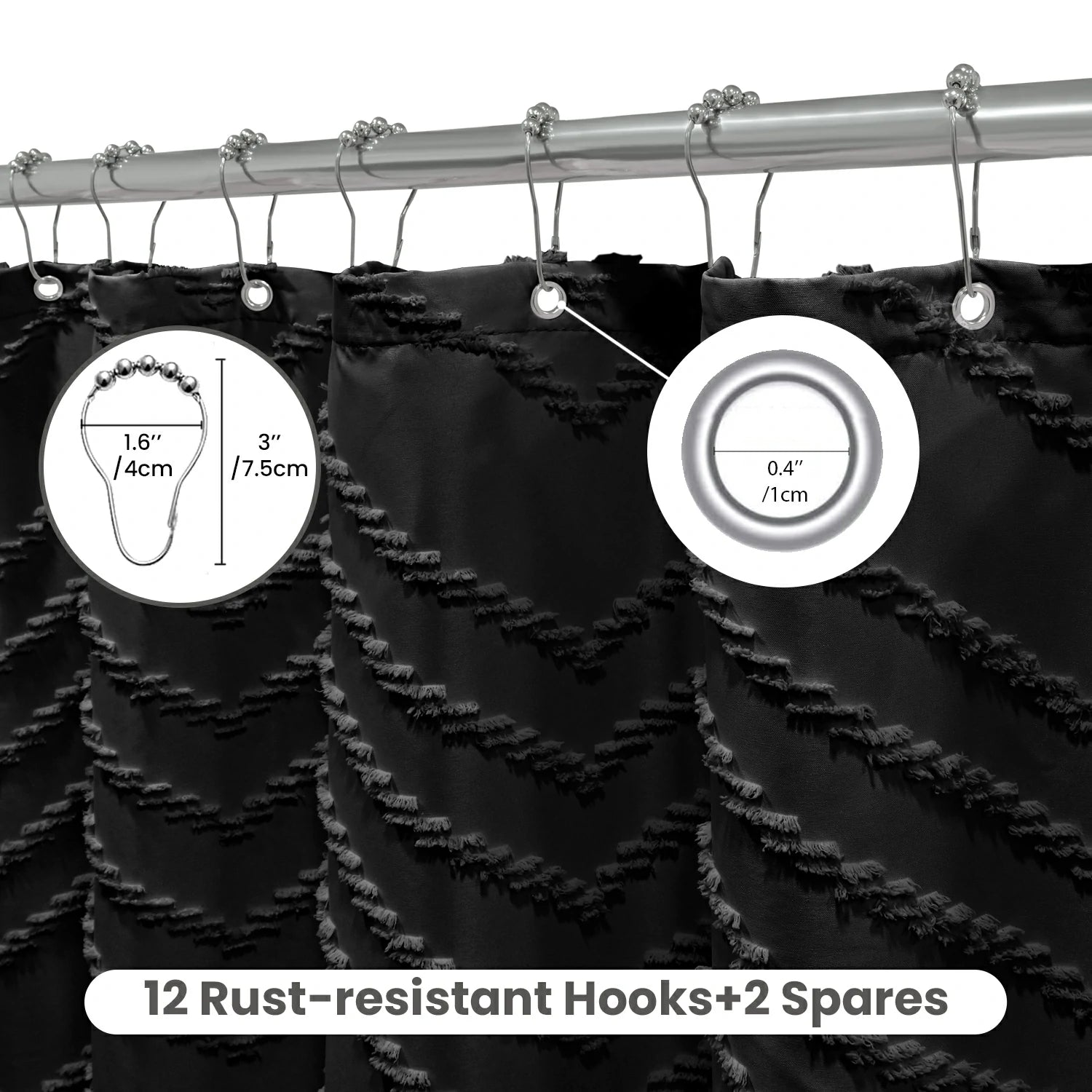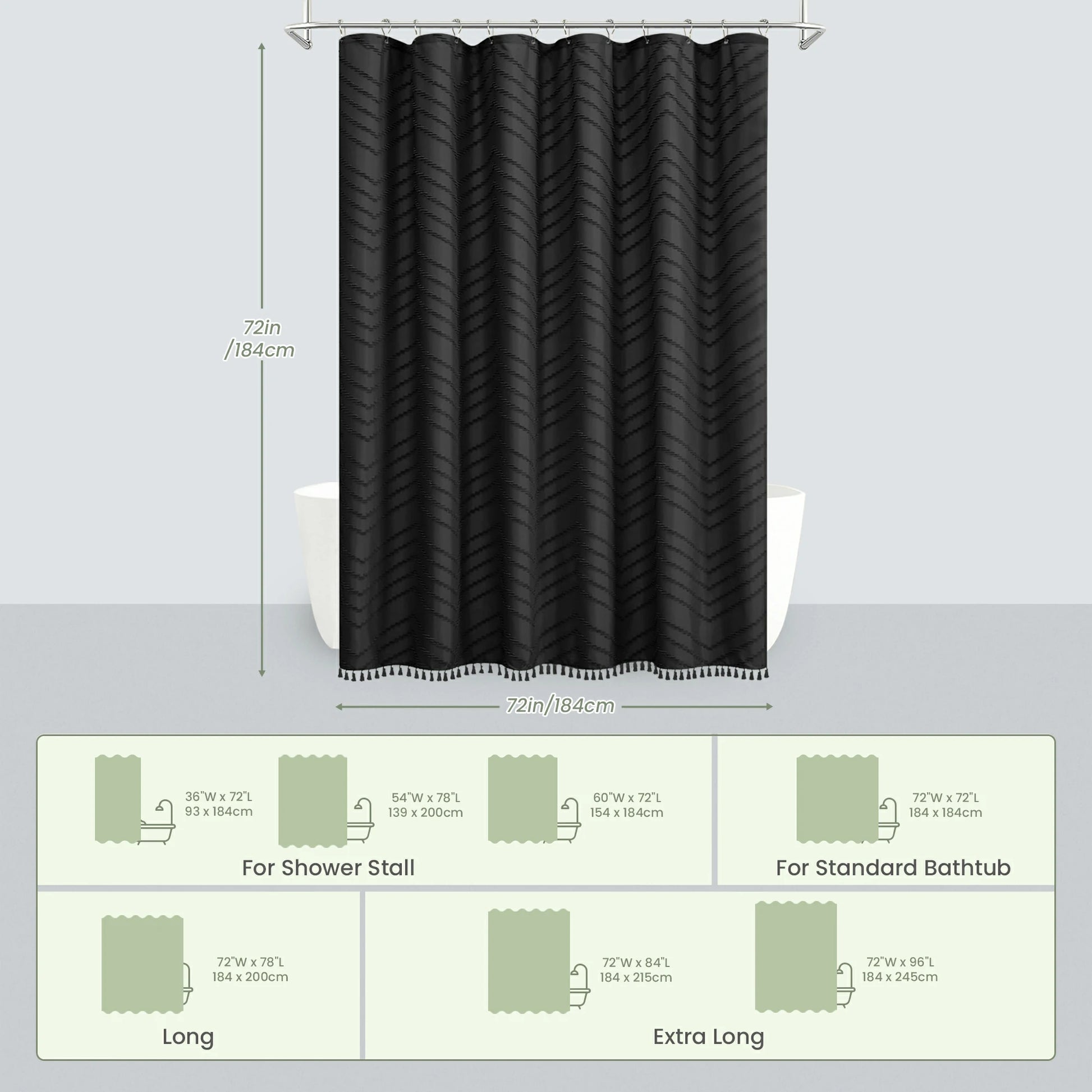 Tufted chevron texture brings a modern boho statement to your bathroom, while the water-repellent, quick-dry polyester helps keep splashes contained and daily upkeep simple. The curtain includes rust-resistant hooks with spares for reliable hanging, and the fringe tassel hem adds a finished look while helping reduce flutter for a calmer, more private shower feel. Soft, breathable fabric is machine washable and designed to resist fading and heavy wrinkles, making it an easy refresh for everyday spaces.