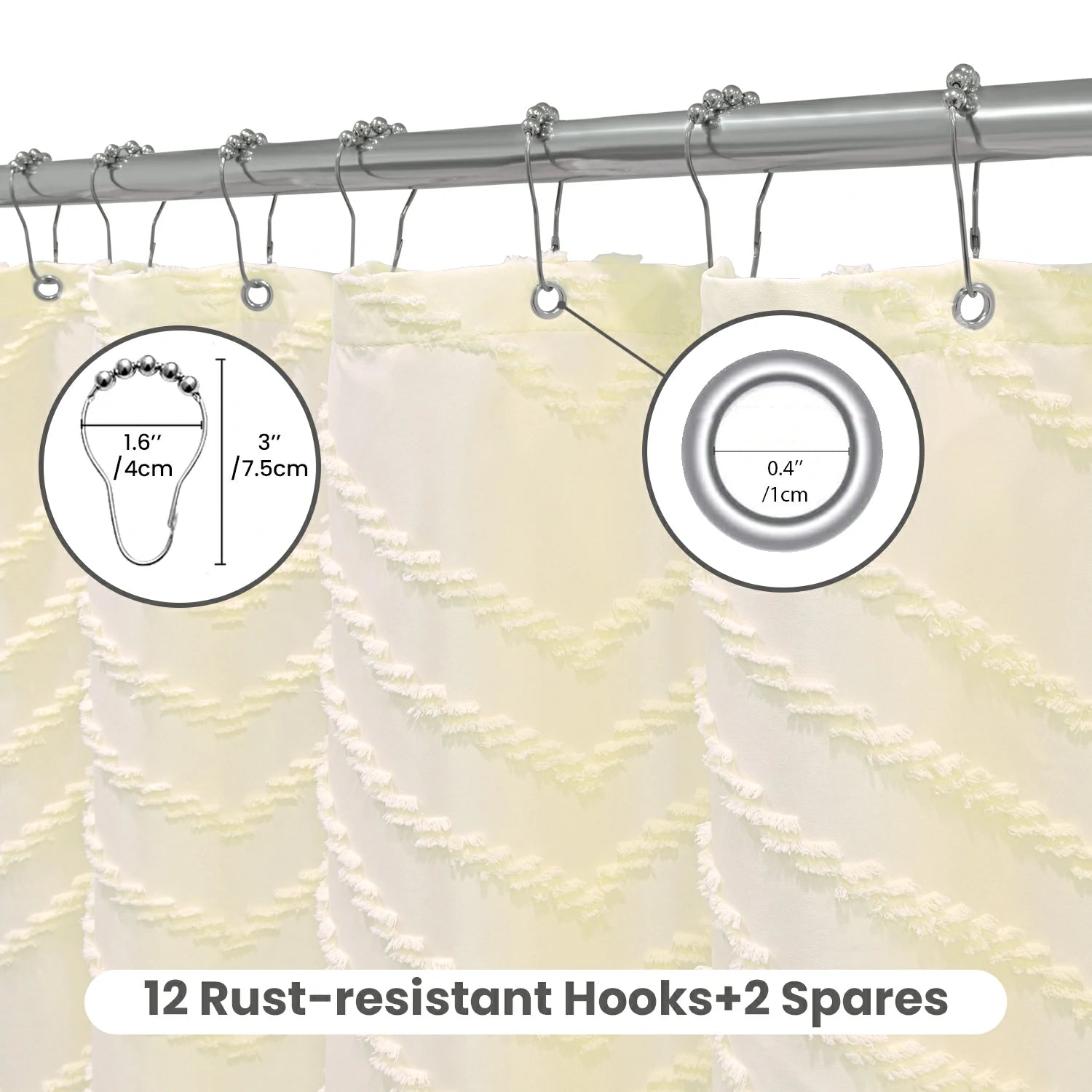 Tufted chevron texture brings a modern boho statement to your bathroom, while the water-repellent, quick-dry polyester helps keep splashes contained and daily upkeep simple. The curtain includes rust-resistant hooks with spares for reliable hanging, and the fringe tassel hem adds a finished look while helping reduce flutter for a calmer, more private shower feel. Soft, breathable fabric is machine washable and designed to resist fading and heavy wrinkles, making it an easy refresh for everyday spaces.